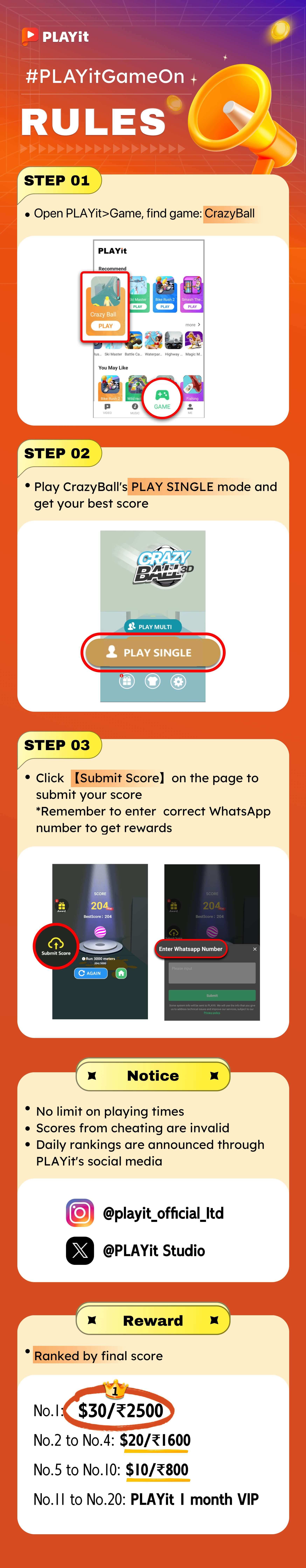 ਤੁਸੀਂ ਸਿਖਰਲੇ ਅੰਕ ਨੂੰ ਚੈਲੈਂਜ਼ ਕਰਨ ਲਈ ਖੇਡ ਸਕਦੇ ਹੋ [Crazy Ball] PLAYit > Game ਵਿੱਚ