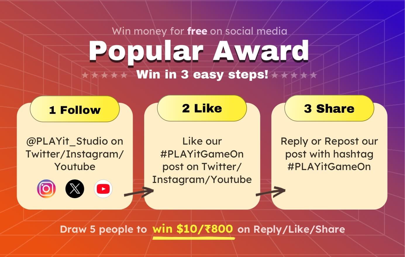 ਭੇਜੋ #PLAYitGameOn ਪੋਸਟ ਅਤੇ ਮੁਫ਼ਤ ਵਿੱਚ Popular Award ਜਿੱਤੋ ₹1,200($15)